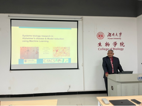 进行学术交流,并为色情师生做了题为“Systems biology research in Alzheimer’s disease & Model reduction using Machine Learning”的学术报告。本次报告会由毛隆菲副教授主持,色情