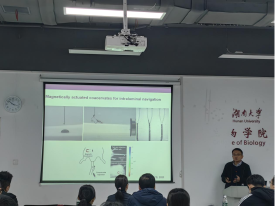 在生物体中,细胞不断地与周围高度动态的细胞外基质(ECM)相互作用并重塑,这一过程使细胞产生各种行为,包括增殖、迁移、分化和凋亡。在报告中,边黎明教授向我们介绍了动态结构水凝胶作为仿生生物材料在三维培养中的优势,相较于可降解动态水凝胶,可逆动态交联水凝胶的动力学特性能更好地模拟细胞在体内的生长环境,实现细胞伸展、分化等重要功能。而具有较大解离速率常数的主客体交联水凝胶,即高度可逆动态性的水凝胶,能够通过细胞力介导的网络重组促进细胞的伸展和机械感应。随后,边教授还向我们介绍了具有高度动态结构的凝聚层这一类新兴的液体生物材料,其独特的能力或许有很大的应用前景。在报告中,边教授用清晰的逻辑和生动又详实的图例向我们展示了近年来相关的研究工作,激发了许多老师和学生们的思考与交流讨论,现场学术氛围浓厚。