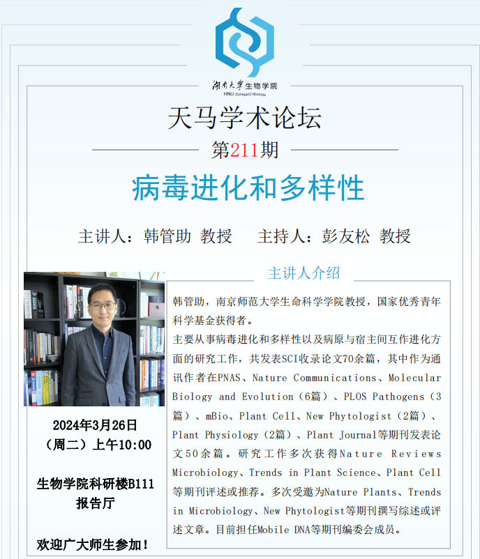 天马学术论坛 第211期--南京师范大学生命科学学院教授