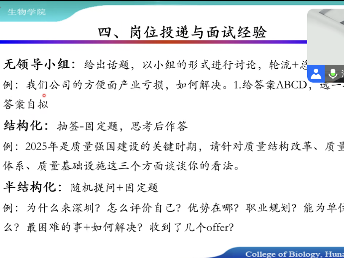 在大家对就业方向有一定基础了解之后,汪朝阳师兄又慷慨分享了自己的求职经验,逐一详尽地分享了简历投递经验、岗位选择经验、以及招聘面试经验,“干货”满满!