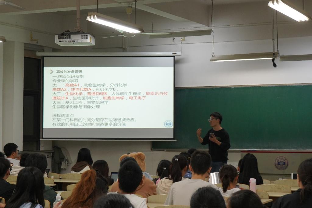 “生才有道”保研经验分享会在综合楼104教室成功开展,9位保送至全国各地优秀高校的同学通过自己的亲身经历,依次向学弟学妹们传授保研之路的经验建议。