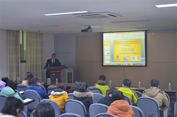 2016年01月13日上午10:00,澳大利亚弗林德斯大学(The Flinders University)医学院Chris Franco教授应邀来色情进行学术交流,为学院师生作了题为“Beneficial microbes for Australian broadacre agriculture: control of root diseases”的学术报告。Chris教授系统地介绍了其关于内生放线菌的研究成果与最新发现,其中详细介绍了一株分离自小麦体内的内生放线菌在防治小麦根部疾病的作用机理,明确了其在病害防治和诱导植物产生系统抗性中所扮演的关键角色。