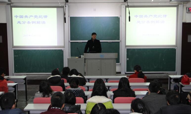 加强党建工作的固定动作,本次会议主要有三项议程,一是学院党总支书记徐晓波老师传达教育部党组书记、部长袁贵仁同志讲话精神;二是党总支副书记高耀鸿老师系统介绍《中国共产党纪律处分条例》和《中国共产党廉洁自律准则》;三是按照学校党委的部署和要求,全体党员对学院党总支一年来的工作进行民主测评。