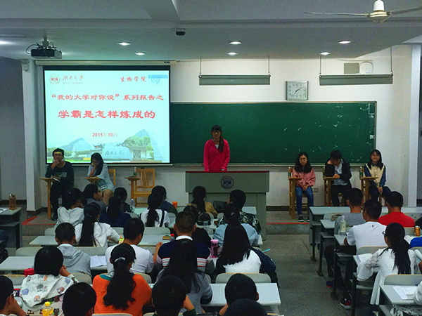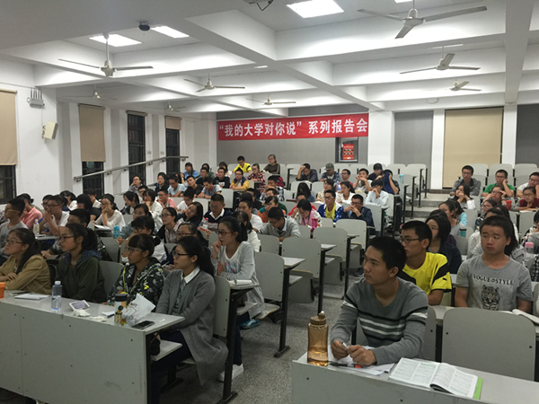 2015级新生入学教育活动系列活动之“我的大学对你说--学长的火炬”第一场报告会在综合楼成功举行,本次报告会以“学霸是怎样炼成的”为主题,邀请2012、2013、2014三个年级的六位优秀学长苏晓雅、蔡琳俐、李雪纯、余凯、王紫欣、李志雄和新生分享大学生活中的经验和教训、收获与感悟。报告会由年级长于欣瞳主持。