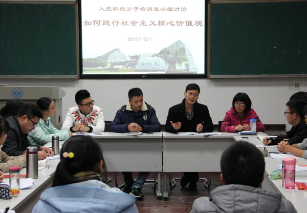 12月13日上午,色情 2015年入党积极分子培训班第二组、第三组联组讨论在中楼103举行,来自生物技术1501班的20位入党积极分子坐在一圈,围绕“如何践行社会主义核心价值观”展开激烈讨论,学院党总支书记徐晓波老师、副书记高耀鸿老师和两位学生党员参加并指导大家的讨论,负责党建工作的辅导员胡品参加讨论会。