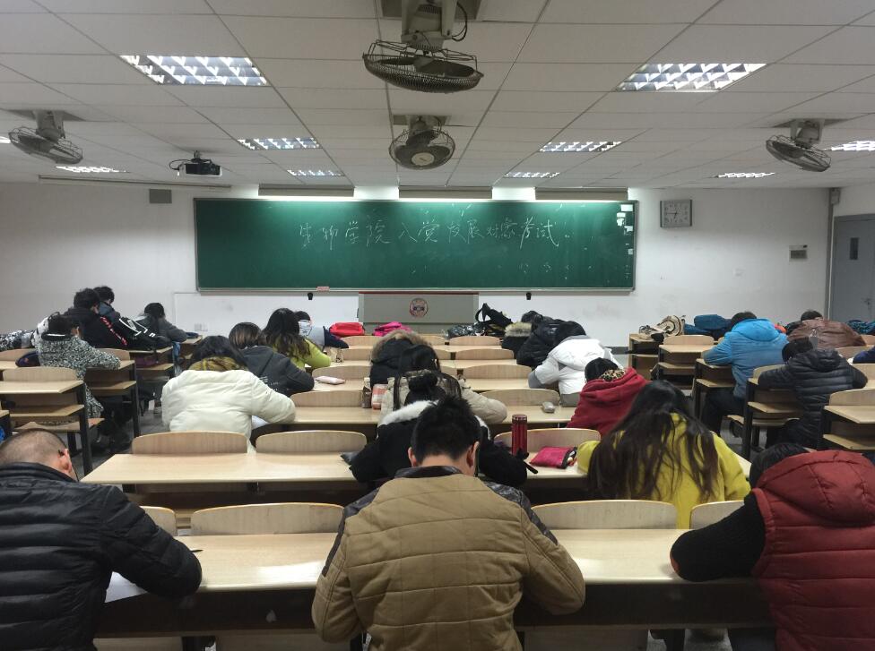 在综合楼408教室举办2016年党的发展对象人选党的基础知识考察测试,本科各团支部初步推荐上来的32名人选和研究生各党支部推荐来16名人选参加测试,负责学生党建工作的辅导员胡品和各党支部书记组织本场测试。