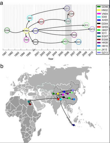 生物信息学是一门综合了生物学、计算机科学、数学等多门学科的交叉科学,它既重视计算方法的发展,同时更加注重方法学与生物学问题的结合。以DNA二代测序技术为代表的高通量实验技术的发展导致了海量生物学数据的积累,如何对它们进行有效的分析挖掘是一个巨大的挑战。彭友松博士等人开发的R软件包”cooccurNet”可以帮助科研人员方便地研究生物学大数据的共进化关联。在大数据时代,生物信息学是生物学发展的“利器”,可以极大地促进生物学各个学科的发展。比如在传染病领域,生物信息学在传染病溯源和预测预警等方面发挥了不可替代的作用。彭友松博士等人正是针对当前广泛流行的禽流感病毒,开发了适用于甲型流感病毒各种血凝素亚型的通用型流感病毒抗原变异预测模型PREDAV-FluA及其软件,可以实现从病毒的基因序列出发快速预测病毒的抗原特征,帮助禽流感监测中及时地发现新的抗原变异病毒;通过计算建模,把所有已知的高致病性禽流感H5N1病毒分为15个抗原类(抗原相似的病毒群体),发现该病毒的抗原进化呈现分化式进化的特点(下图a),其抗原进化过程主要在我国发生,随后它从我国传播到其他国家和地区(在某些国家和地区如印尼和埃及也会进化出新抗原类)(下图b),导致该病毒在全球形成很大的抗原多样性,不利于全球禽流感疫苗计划的实施。这些工作对于深入理解禽流感病毒的抗原进化以及对于它们的防控具有较大的参考价值。