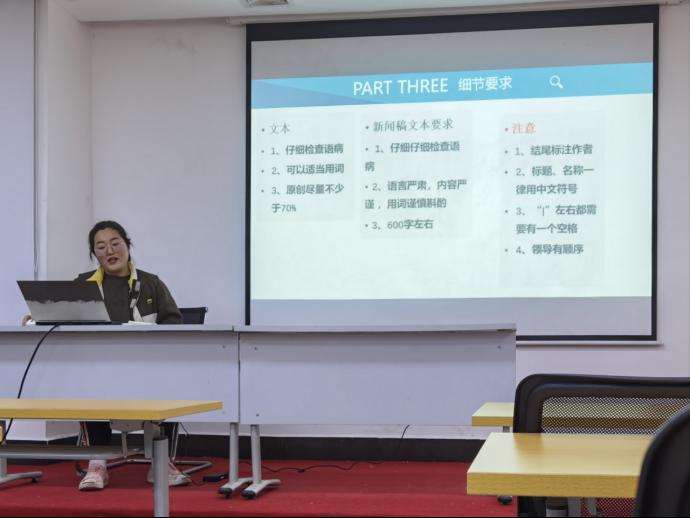 接着,由新媒体中心部长张裕介绍了发布新闻稿件的步骤、撰写的细节要求以及交稿的截止时间和方式。通过一些错误例子及正确示范,强调了新闻稿中文本、图片包括一些其他细节常出现的错误及改正方式。