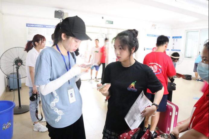 随后,志愿者将新生引导至各自寝室,一路上为新生介绍园区基础设施,亲切的同新生交谈,拉近与新生的距离。到达寝室楼栋,新生助理认真负责地为每一位新生进行扫码报道。