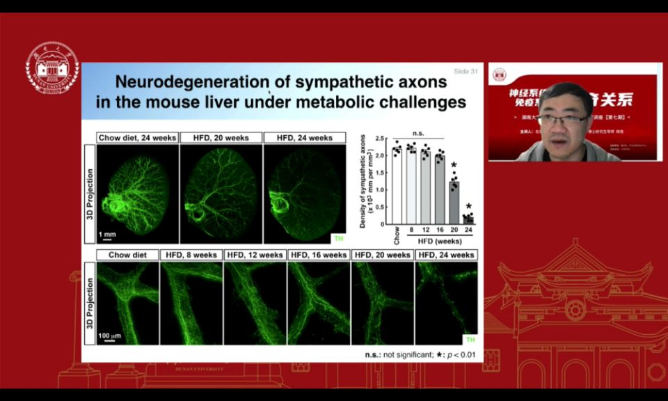 杨竞教授将讲座分为了三部分。第一部分介绍了器官组织如肺、肝脏、骨骼和肠道等全组织的三维荧光免疫染色与成像技术。三维成像技术的开发,是当今神经-免疫互作与调控的重要进展,通过整合跨学科手段,开拓生理或病理条件下神经-免疫调控的全新视角,为治疗各类相关疾病提供了切入点,为深入理解人类疾病开拓全新视角。第二部分讲述了以三维荧光成像技术和跨学科手段研究肺部免疫的神经调控机制。从新冠肺炎引入了这部分内容,杨教授课题组通过三维成像观察,发现了肺部的交感神经分布只存在于气管中,并非气泡中。又通过跨学科的各种手段发现了肺部交感神经的缺失会导致急性肺损伤的加剧。第三部分则介绍了在代谢疾病中的重要代谢器官肝脏交感神经垫的免疫调控机制。通过三维成像观察,发现了无论小鼠还是人类的肝脏神经分布均为顺着血管分布的交感神经,而不存在副交感神经。又通过深入研究发现高脂饮食导致损伤的肝脏交感神经是可以再生。这项研究为肝脏代谢疾病的治疗提供了新的思路。