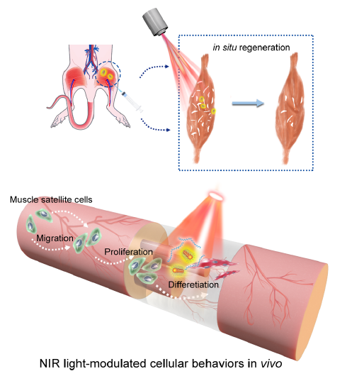 骨骼肌损伤愈合的过程包括肌肉卫星细胞的激活、定向迁移、分裂增殖形成新的肌管细胞,进而发育成肌纤维,在肌肉功能恢复中起关键作用。受体酪氨酸激酶(RTK)信号转导途径协调细胞增殖,分化和迁移等多种细胞功能。近年来,光遗传学的发展为精确控制受体介导的细胞行为提供了有强大的工具。然而,大多数基于光响应受体的操控需要对细胞进行遗传改造,且这些受体仅对紫外线或可见光响应,无法实现穿透厚组织的远程控制。因此,光遗传的方法难以在骨骼肌等深层组织修复的过程中实现对特定细胞的精准调控。