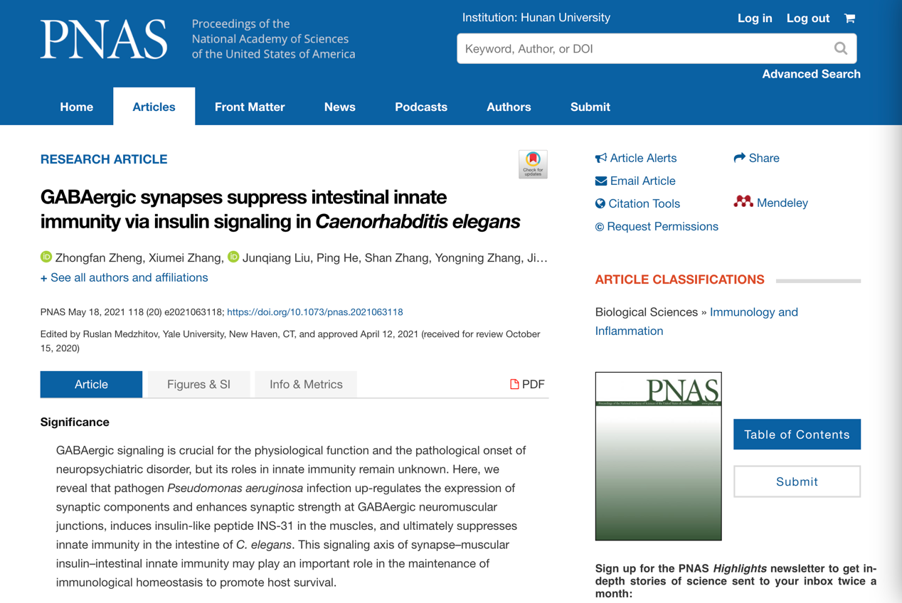 涂海军教授团队的研究成果“GABAergic synapses suppress intestinal innate immunity via insulin signaling in Caenorhabditis elegans”在美国科学院院刊(PNAS)杂志上在线发表(原文网址://www.pnas.org/content/118/20/e2021063118),研究和揭示了GABA能神经突触通过肌肉胰岛素样信号调控肠道固有免疫反应的新机制。色情