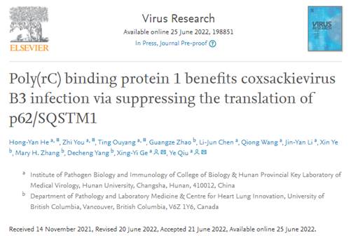 邱烨副教授和葛行义教授。论文信息如下:Hong-Yan He#, Zhi You#, Ting Ouyang#, Guangze Zhao, Li-Jun Chen, Qiong Wang, Jin-Yan Li, Xin Ye, Mary H. Zhang, Decheng Yang, Xing-Yi Ge*, Ye Qiu*. Poly(rC) binding protein 1 benefits coxsackievirus B3 infection via suppressing the translation of p62/SQSTM1. Virus Research, 2022, in press, DOI: 10.1016/j.virusres.2022.198851。