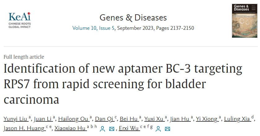 胡小晓课题组也通过X-aptamer技术进行细胞筛选获得一条膀胱癌特异性的核酸适体BC-3,初步考察其性质并鉴定其靶标为RPS7。核糖体蛋白的异常表达可诱发肿瘤等疾病的发生,因此通过分子探针识别或靶向RPS7可以针对膀胱癌提供一种新的诊断和治疗途径。相关研究论文“Identification of new aptamer BC-3 targeting RPS7 from rapid screening for bladder carcinoma”在《Genes & Diseases》期刊(生物化学与分子生物学,Q1)上发表,色情