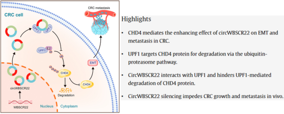 李兆勇教授团队在中科院一区TOP期刊International Journal of Biological Macromolecules发表题为“Circular RNA circWBSCR22 facilitates colorectal cancer metastasis by enhancing CHD4's protein stability”的研究论文。该研究首先鉴定了circWBSCR22是一种真实存在的环状RNA,且在结直肠癌组织中高表达。此外发现circWBSCR22促进结直肠癌细胞的增殖、转移和侵袭,而CHD4蛋白介导了circWBSCR22在结直肠癌细胞中对EMT (epithelial-mesenchymal transition)、转移和侵袭的促进效应(图1)。